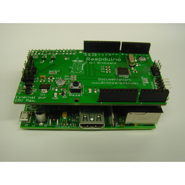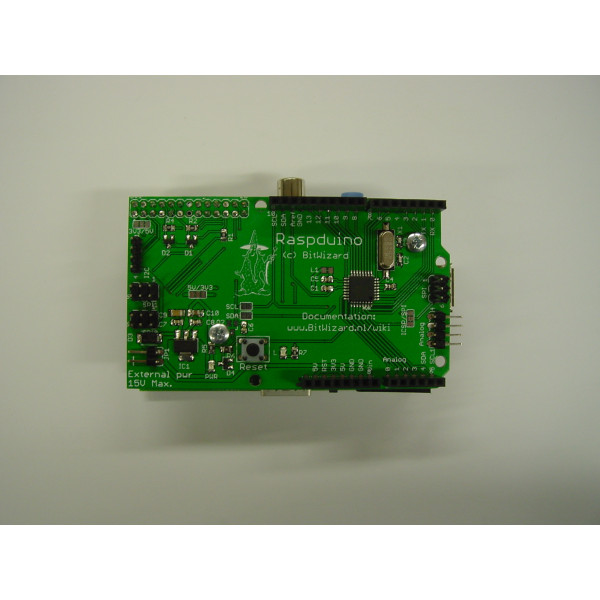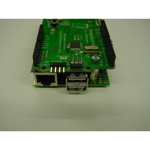 The Raspduino is an Arduino compatible microcontroller board, designed to plug on top of a Raspberry Pi (some people like to call this a Pi Plate). It is then possible to add Arduino shields to the Raspduino.